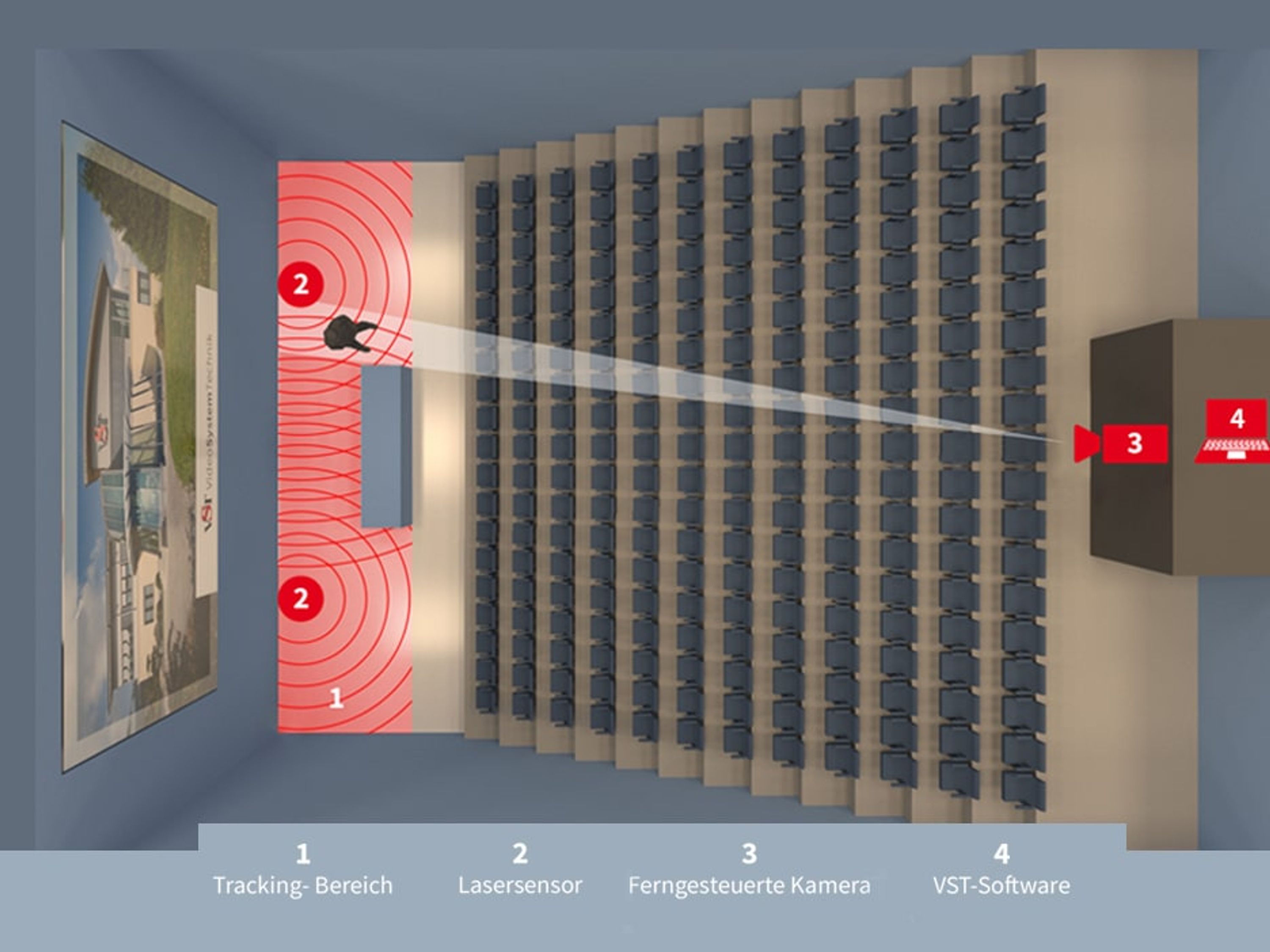 Die TrackingMaster-Software wertet die Daten in Echtzeit aus und filtert die für die Kameraverfolgung relevanten Positionen heraus. Der Tracking-PC kann durch die Netzwerkanbindung in einem separaten Raum betrieben werden. Aufgrund der erkannten Positionen wird die Ansteuerung der Tracking-PTZ-Kamera vorgenommen.